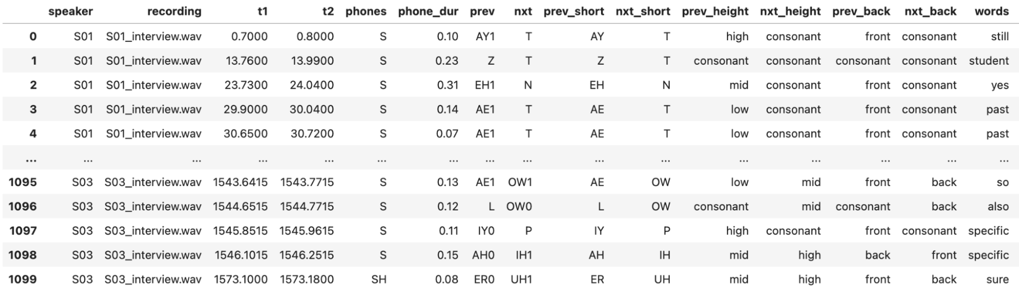 To do this, first we need to create two new columns containing the previous and following sounds, but omitting the stress markings (e.g., the ‘1’ in ‘AY1’) that got added by default during the forced alignment process (see the documentation for the Montreal Forced Aligner to learn more). We’re inserting these columns at indices 8 and 9 so that all the phone-related columns are next to each other. Now, each row of the new column prev_short contains only the first two characters from the corresponding cell in prev; likewise for nxt_shortand nxt